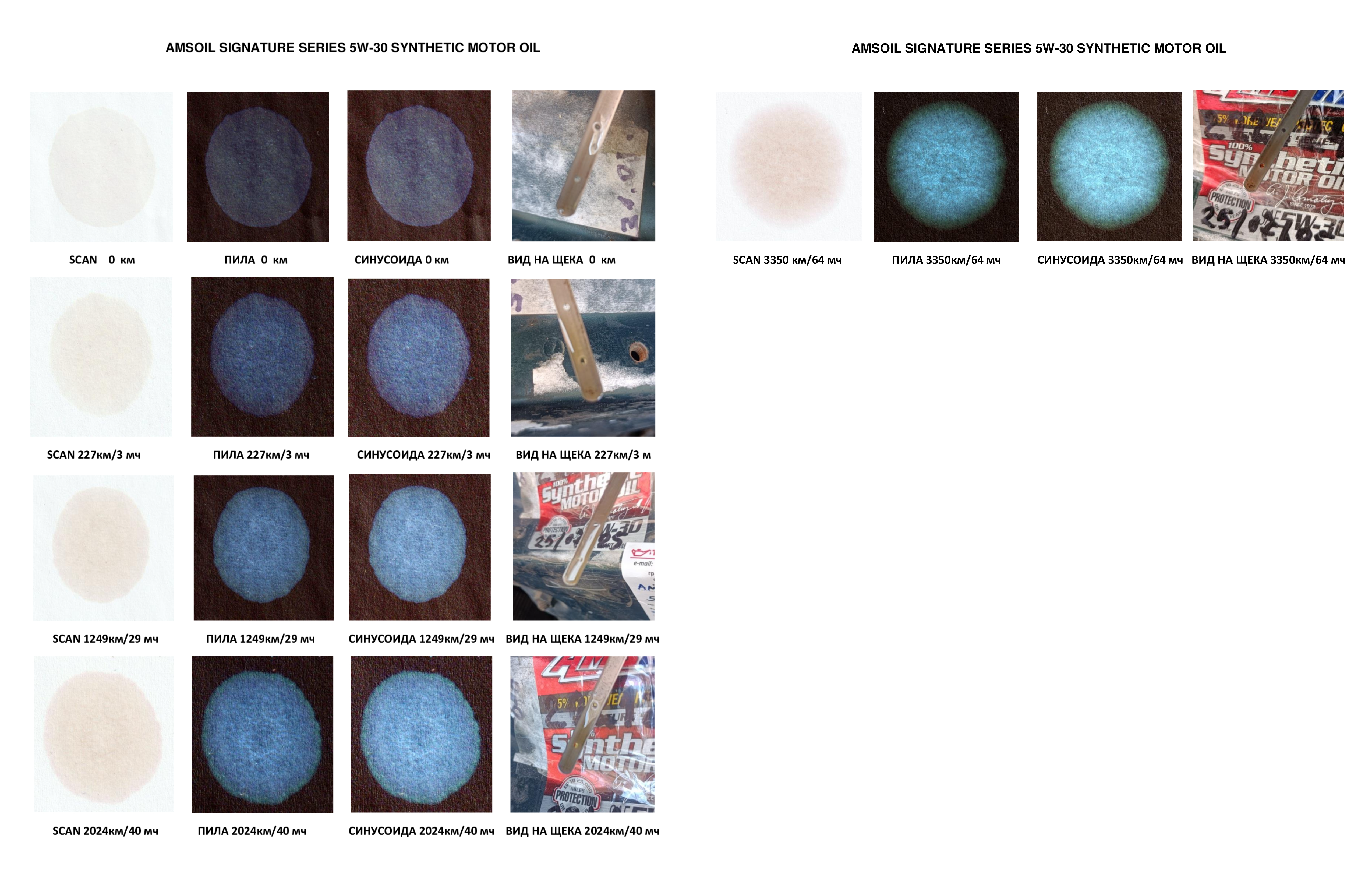 Тъмнозелен самурай G86-P 355 #1806 Отговорено 17 Ноември (Редактирано) Здравейте, Четвърти тест с масло AMSOIL SIGNATURE SERIES 5W-30 SYNTHETIC MOTOR OIL 1) Автомобил – Honda Accord 6, F18B2, ръчни скорости, 2001г.; 2) Масло – AMSOIL SIGNATURE SERIES 5W-30 SYNTHETIC MOTOR OIL 3) Маслен филтър–AMSOIL CAR OIL FILTER Ea15K1,Въздушен BOSCH 1987429185; 4) Общ пробег на автомобила – 225474 км; 5) Пробег на маслото в момента на вземане на пробата – 3350 км; 6) Цикъл (извънградско/градско – 80/20; 7) Средна скорост ≈ 52 км/ч; 8) Сезон на експлоатация – от 25. 07. 2025; 9) Моточасове – 64 ; 10) Изразходвано гориво – LPG около 325 литра ЕКО (България), Shell, DS Oil, Lukoil, FAR Petroleum; 11) Kтм = (л.190 / 4.3 л.) ≈ 75; 12) Пробата е взета от напълно загрял двигател след магистрална експлоатация 7 минути след гасене и е сушена 24 часа на стайна температура; 13) Обем на налятото чисто масло при смяната – 4,3 л; 14) Доливане на масло – не, 15) Други - източени около 330 мл от картера след оттичане. Предходни масла Castrol 10W40 (немски) на около 10000, но на около 2 г., Liqui Molly 10W40 ACEA A3 ∙ ACEA B4 ∙ API SL на 6850 км. Honda Synthetic Blend 5W-30 – 6350 км, PETRO-CANADA SS 5w30 на 4890 км., MOTUL 8100 Eco-lite 5w30 на 9650 км - предимно магистрално каране, Prista Ultra G 5W30 от Markony’s Garage – 4771 км., Amsoil XL 5W30 -7389 км., RAVENOL SVE Standard Viscosity Ester Oil SAE 5W-30 High Mileage –7280 км., Mobil 1™ ESP 5W-30 – 7076 км, Liquimoly Specialtec DX1 5W-30+Liqui Moly Oil Additiv MOS2 – 720 км, PETRO CANADA SS 50W30 - 4612 км., RAVENOL DXG SAE 5W-30 – 7717 км. Режим - рядко над 4000 об./мин. Пробата е сканирана на скенер Canon TR4600 series 3 in1 с разд. способност 600 dpi. на офисна хартия с леко докосване на щеката до хартията (Office 1 Copy Paper Standard) P.S. Няма ли най-после да се оправи търсачката в сайта?! Редактирано 17 Ноември от Тъмнозелен самурай G86-P 1 Сподели публикацията Адрес на коментара Сподели в други сайтове