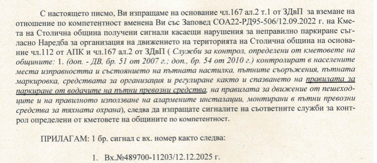 Моите уважения но това изобщо не е вярно. Тук имаме колеги от КАТ и може да ги попитате. Общината може да слага скоби и да вдига с паяка но не може да глобява на място това се извършва само от КАТ.