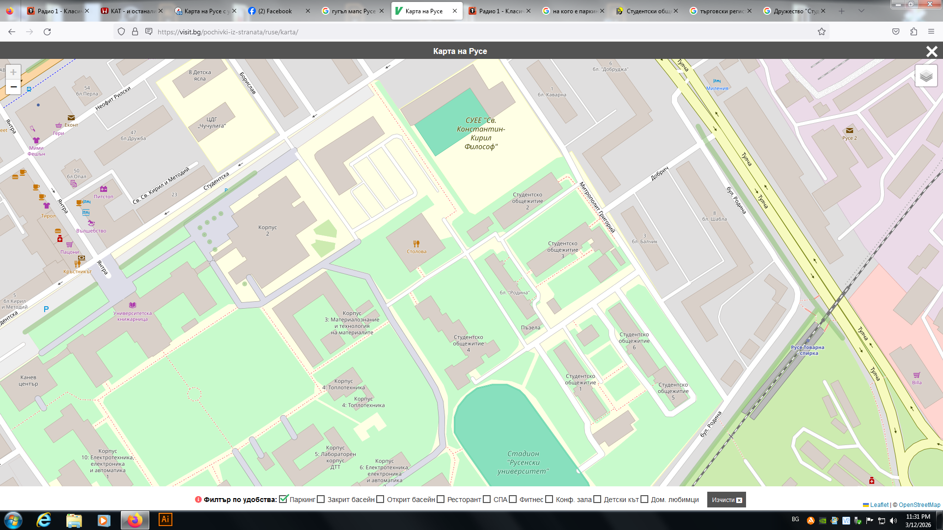 Градска зона (извън кампуса): Ако паркирате на улиците около университета, които попадат в Синята зона на Община Русе, цената е 1.50 лв. на час. Общината предлага и месечни абонаменти за платени зони, но те са значително по-скъпи (обикновено над 100.00 лв. на месец за физически лица без постоянен адрес в зоната).